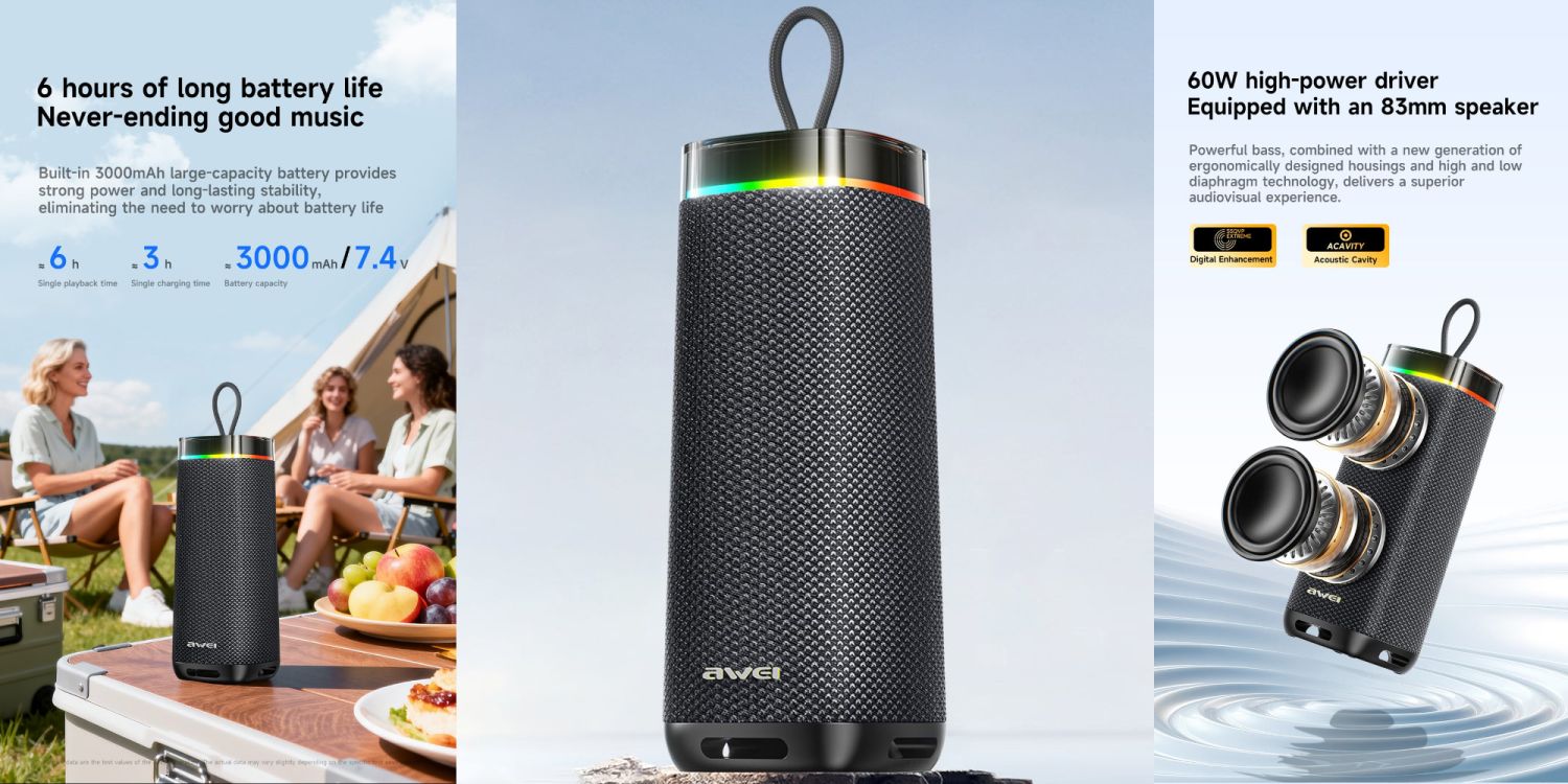 When the party needs real volume, small speakers simply fall short. Awei KA66 answers with a commanding 60W output driven by large 83 mm drivers that push powerful, room filling sound. Bluetooth 5.3 ensures stable transmission, while TWS support lets you pair two units for a wider stereo stage. With IPX7 waterproof protection, RGB lighting, and a portable lanyard design, it is built for outdoor gatherings, poolside sessions, and travel adventures.