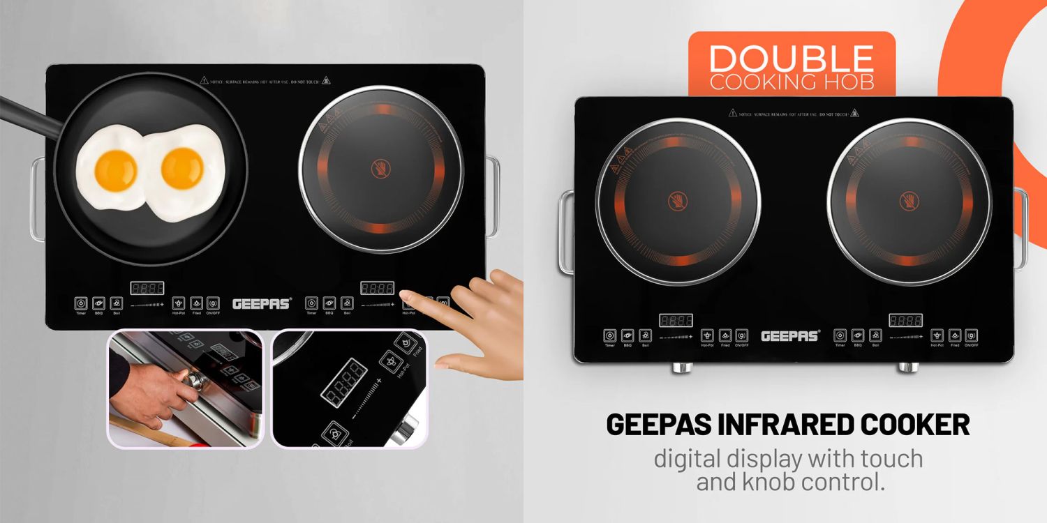 Cook faster, smarter, and safer with precision infrared technology. The Geepas GIC6131S Digital Infrared Cooker - 3600W is a powerful double cooking hob engineered for modern kitchens that demand speed, efficiency, and versatility. This high-performance cooker features dual ceramic heating plates with a combined 3600 watts of power, delivering rapid and even heat distribution for everything from quick stir-fries to slow simmering. The intuitive touch and knob control system paired with a bright digital LED display makes temperature adjustments effortless and precise.