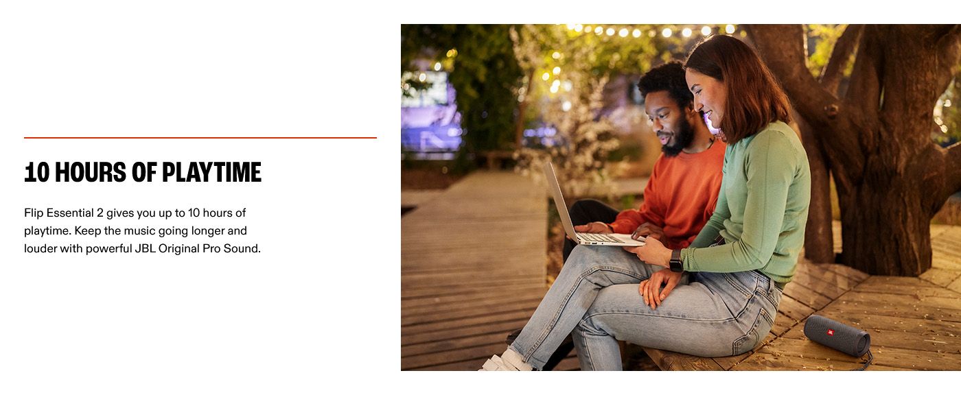 Take JBL Flip Essential 2 anywhere rain or shine. This compact IPX7 speaker pumps JBL Pro Sound from racetrack drivers, hitting 65 Hz to 20 kHz with surprising low end. Thanks to the IPX7 compact design, it outsmarts splashes and light rain. The racetrack shaped drivers fill the room with surprisingly deep bass of JBL Original Pro Sound. From 65Hz to 20KHz response, Flip Essential 2 reproduces every detail. And a massive battery allows up to 10 hours of non-stop playback, so you're always set for the monsoon hike or solo trip of the year.