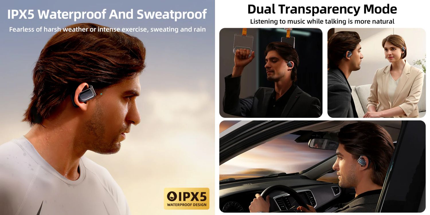 | Other Features / Info | Open-ear design, HFP/A2DP/AVRCP support, ABS + silicone build, 120h standby (connected) |