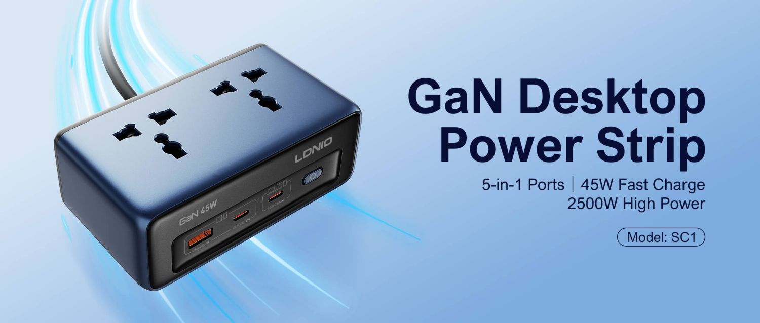 LDNIO's SC1 is a compact yet versatile next-gen power solution; from personal gadgets to home appliances. Accepting EU, UK & US plugs along with 2x USB C and 1X USB A port, its PD3.0, QC3.0 & PPS compatibility ensures safe power at rapid rates. Having GaN technology, it runs cooler while also providing unmatched protection against hazards like overcharge or overheating. Delivering 2500W total output, charging anything from drones to blenders has never been easier, thanks to LDNIO SC1 45W PD Adapter Universal Power Socket.