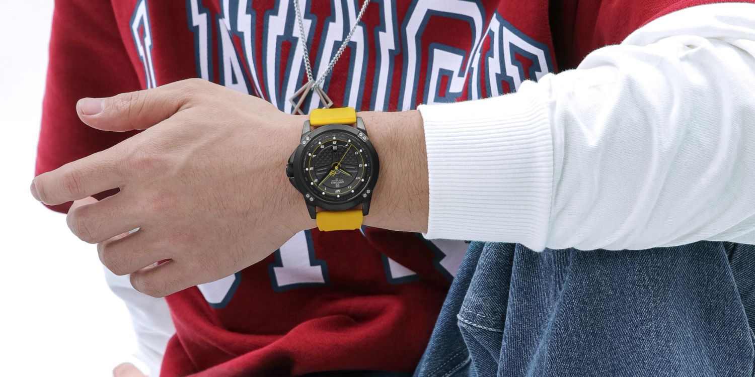 The dial's unique steering wheel-inspired design breaks away from conventional watch faces, introducing a playful yet purposeful element that resonates with automotive culture. Grid patterns and contrasting color accents outline track-inspired geometry.