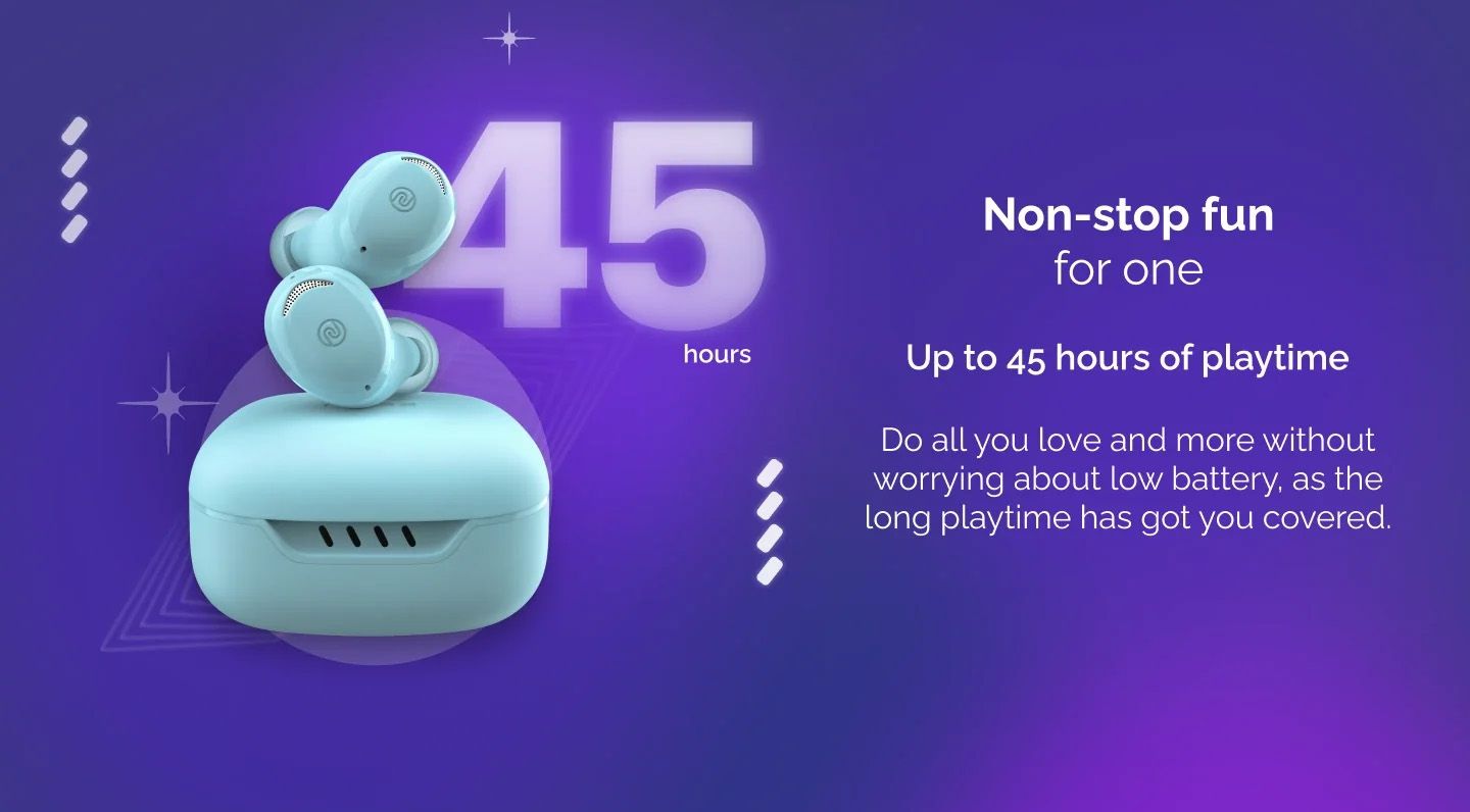 Jump into the dance floor and listen to amazing music with Buds Trance TWS Earbuds from Noise. Comes with a diverse set of colorful shades which motivates you to feel rhythmic with your music. Precise sound listening experience from your favorite soundtrack is possible with a 6mm speaker driver inside this Buds Trance. Dedicated game mode lets you stay focused while playing your favorite games. Get ultra low-latency support for enjoying accurate sync between your media content. Work, exercise or have a quick run without any worries about sweat or sudden water splashes with IPX5 water-resistant for the earbuds. Comes with quick charging capability InstaCharge technology which ensures swift charging. Longer battery life of up to 45hr gives you enough time to communicate and gaming without worrying about battery life for hours.