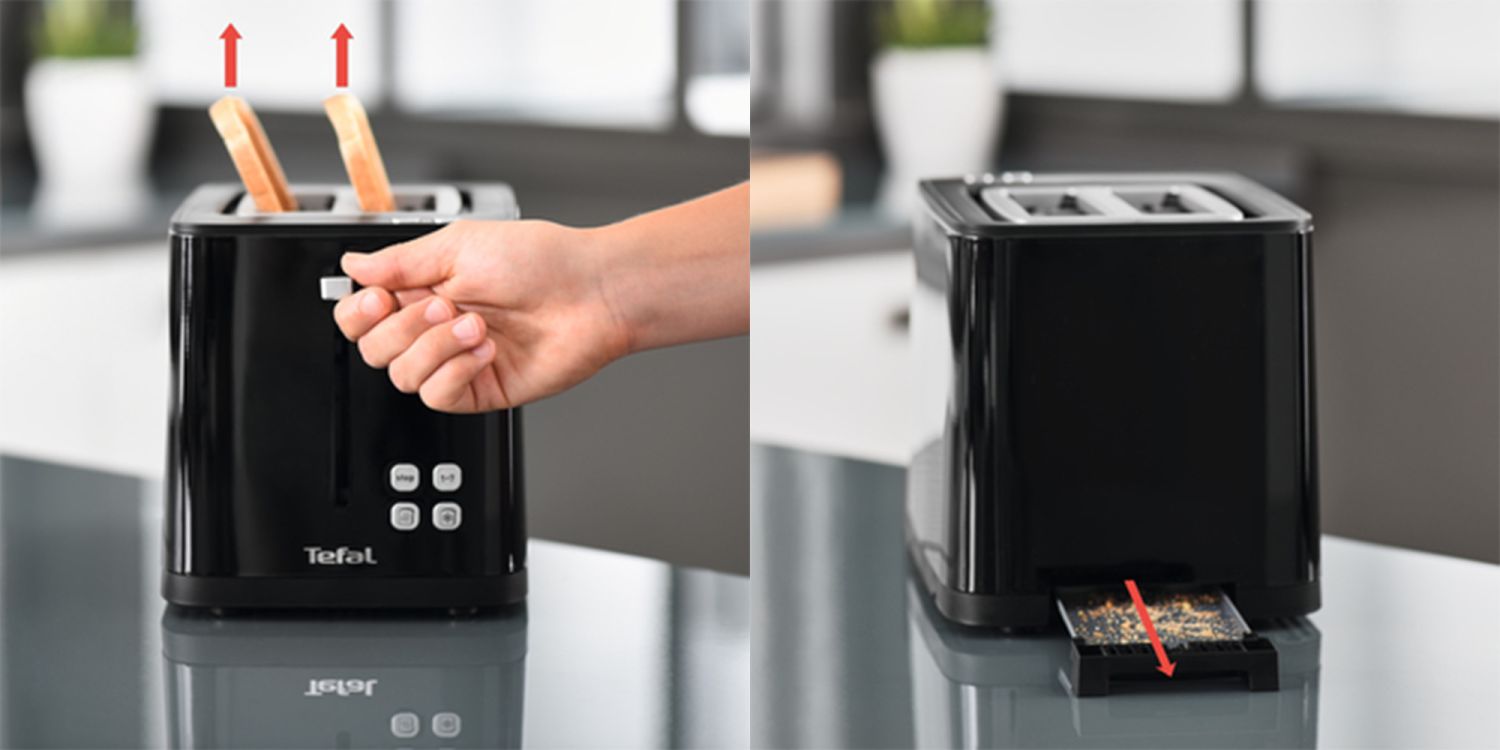 - Removable crumb tray slides out smoothly, making cleanup quick simple and free