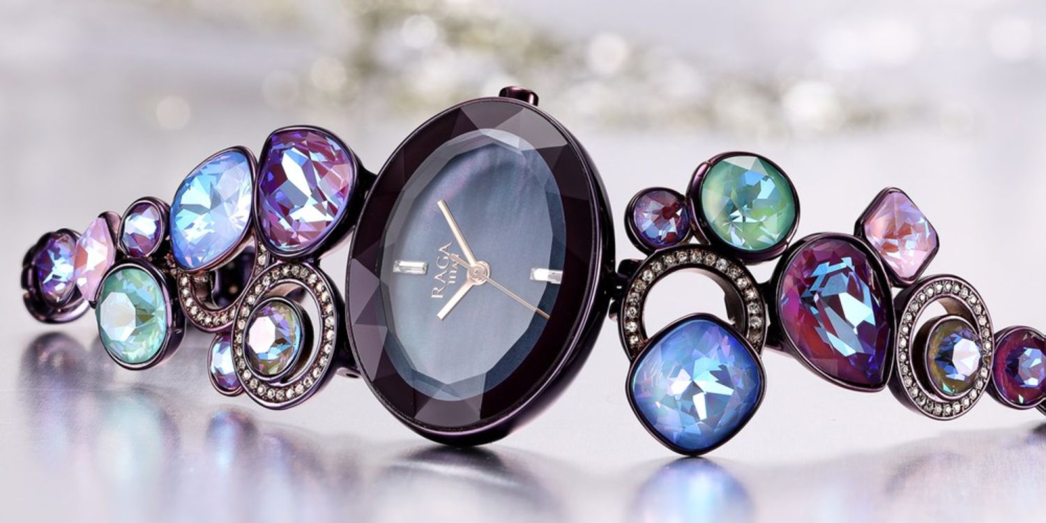 Multicolor crystal embellishments and a refined metal strap give this watch a luxury jewelry feel, perfect for festive wear and elegant occasions.