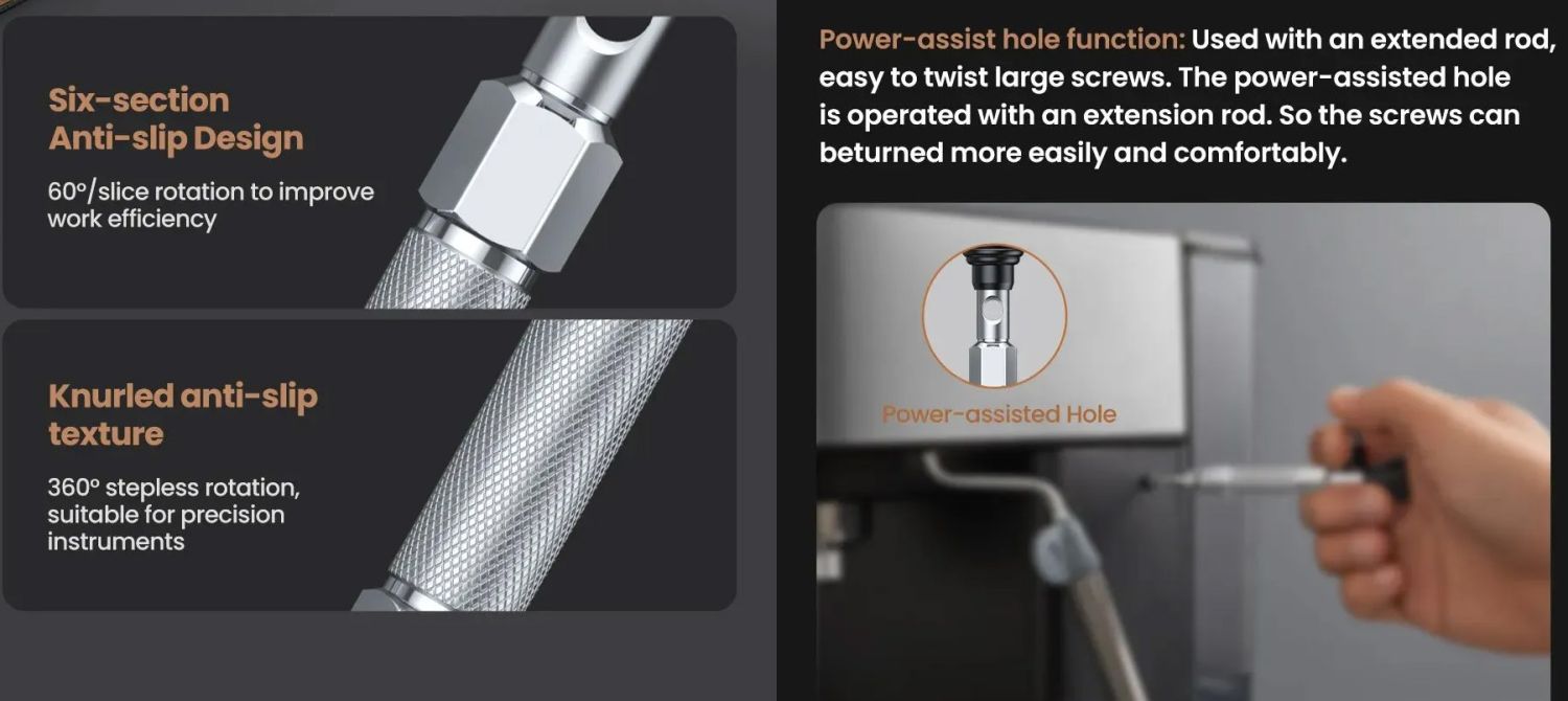 Use the power-assist hole with an extension rod to make turning large screws much easier. It helps you twist screws comfortably and quickly without using extra effort.