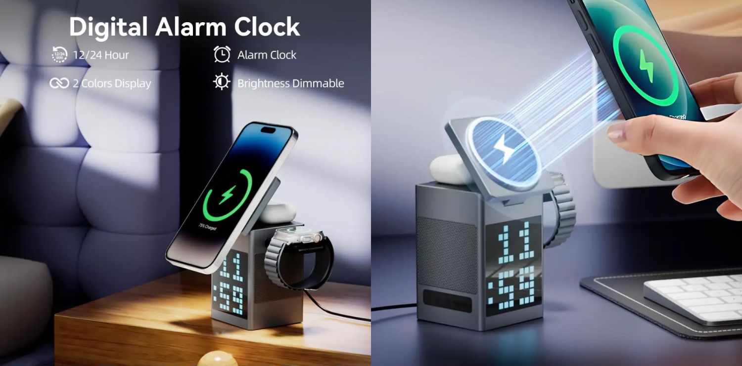 Give your daily setup a modern boost with a charger that feels smart and effortless from the first look. The Valdus Pixel Dock 5-in-1 Wireless Charger powers your phone, earbuds and watch with smooth wireless charging that supports both Qi and MagSafe. Its built-in speaker delivers clear sound and the LED clock lets you adjust brightness to match your room. You also get handy features like an alarm night mode and temperature display. With a strong flame-retardant body and full safety protection it keeps your space neat, safe and always ready.